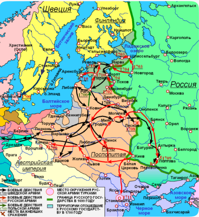 Обязательно будет отмечена Полтава — место главной битвы 1709 года. Обрати внимание, что одна из стрелок идёт далеко на юг и останавливается именно под Полтавой.