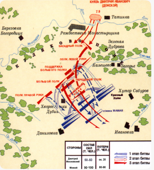 Во-первых, на ней всегда отмечен засадный полк — именно он решил исход сражения. Спрятанный в лесу засадный полк под командованием Дмитрия Боброка-Волынского в нужный момент ударил по татаро-монголам и изменил ход битвы.