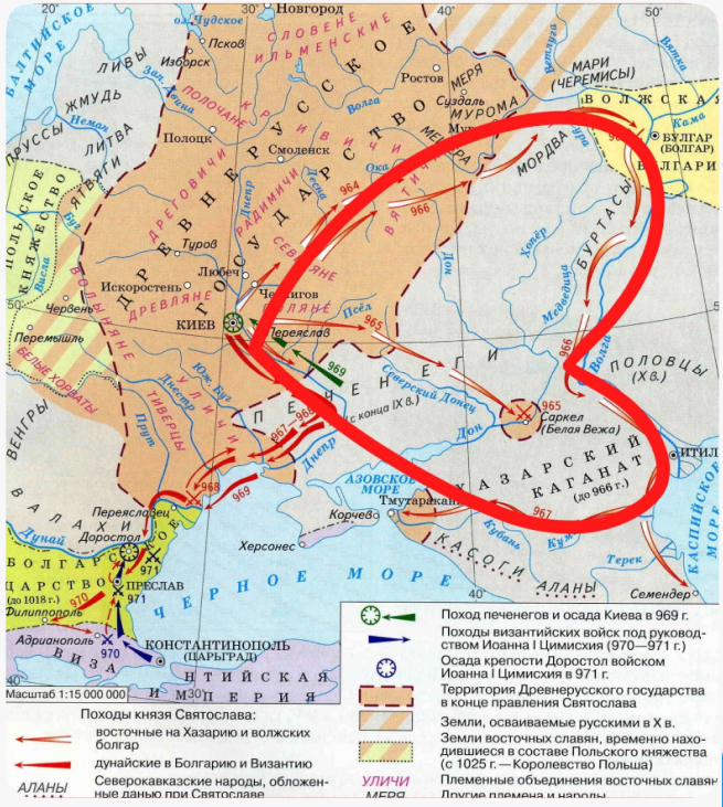 Важный исторический нюанс: походы Святослава были масштабными, но территорий он почти не присоединил. Хазарский каганат разгромил, но земли не забрал. Болгаро-византийский конфликт ничем хорошим не кончился, и князя убили на обратном пути.