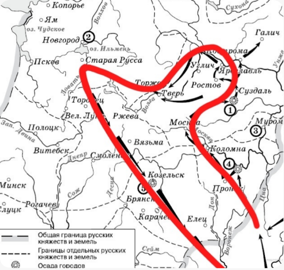 Стрелочки на карте проходят через ключевые города Северо-Восточной Руси: Коломну, Москву, Суздаль, Ярославль, Тверь, Торжок. А потом происходит кое-что интересное: татаро-монголы резко разворачиваются, не дойдя до Новгорода, из-за того, что дороги весной размыло. Враги просто не смогли пройти — Новгород был спасён природой.
