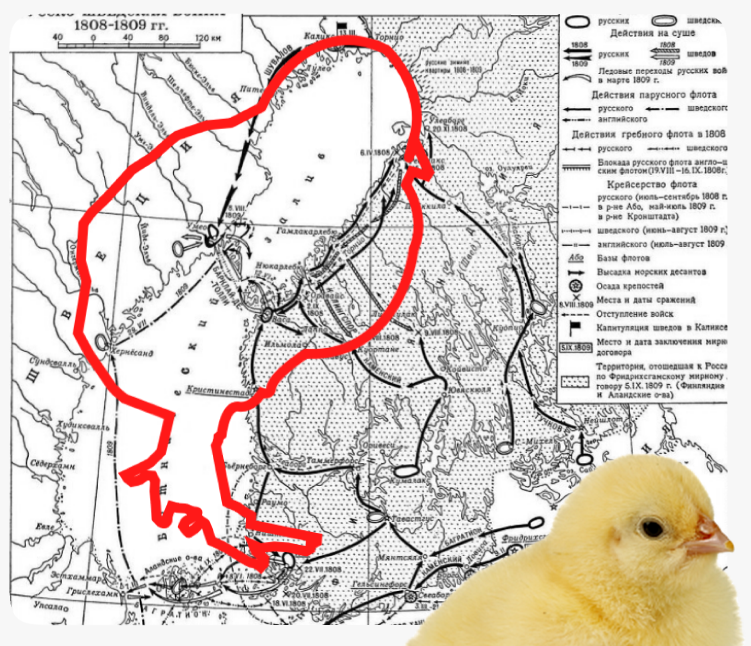 А на карте Русско-шведской войны контур Ботнического залива вместе со стрелками похож на цыплёнка.