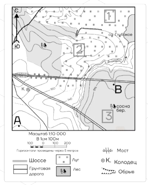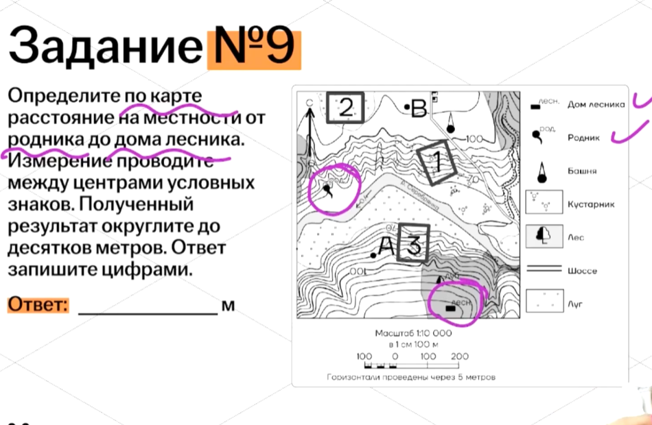 Масштаб тоже нужен для решения задания. Это величина, которая показывает, во сколько раз расстояние на данной карте уменьшено по сравнению с реальными расстояниями на местности. Например, каждый сантиметр на карте выше — это 100 метров в реальной жизни.