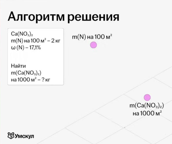 У нас есть формула, масса азота на 100 квадратных метров (2 кг) и массовая доля азота, которую мы посчитали, — 17,1%. А нам нужно рассчитать массу удобрения на тысячу квадратных метров.