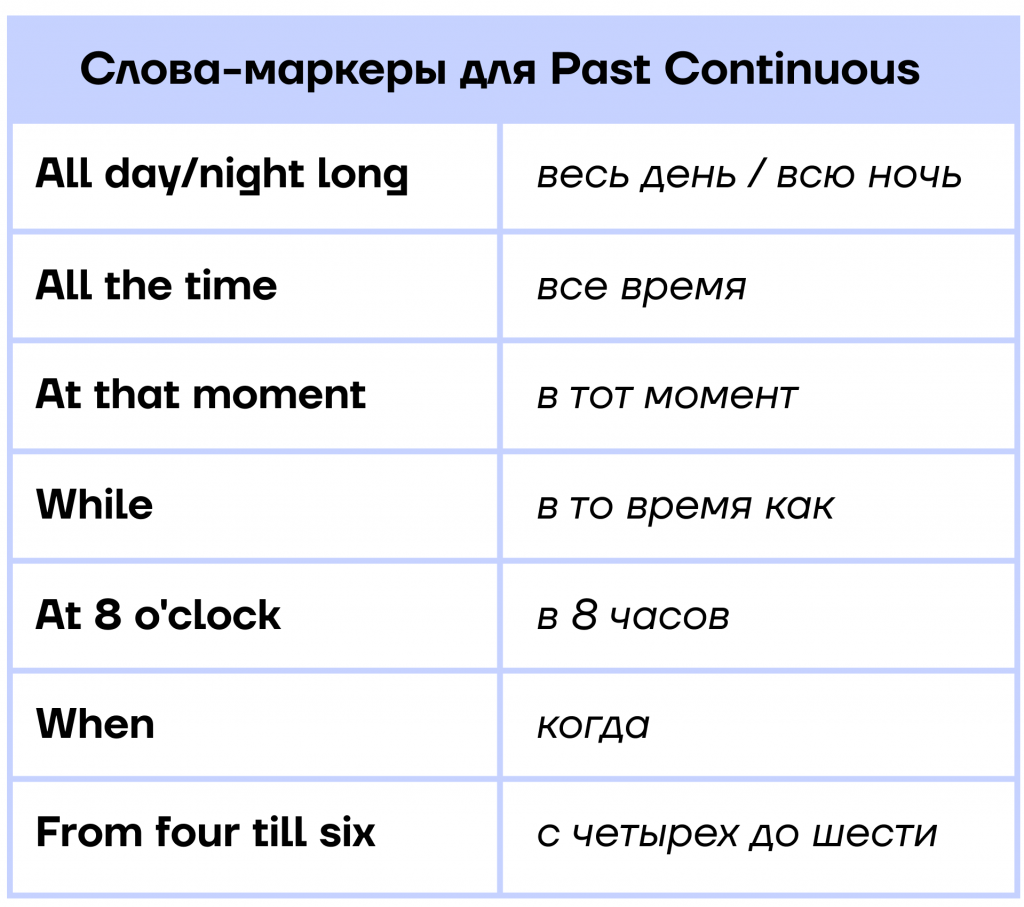 Past Continuous показывает действие, которое длилось какое-то время в прошлом. Здесь обычно используются уточняющие слова, такие как наречия времени: yesterday, two days ago и другие. В предложении еще может быть указан период времени, когда происходило действие.