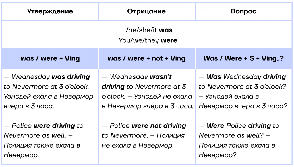 - В утвердительных предложениях нужно добавить вспомогательный глагол to be в прошедшем времени — was/were и смысловой глагол с окончанием -ing.