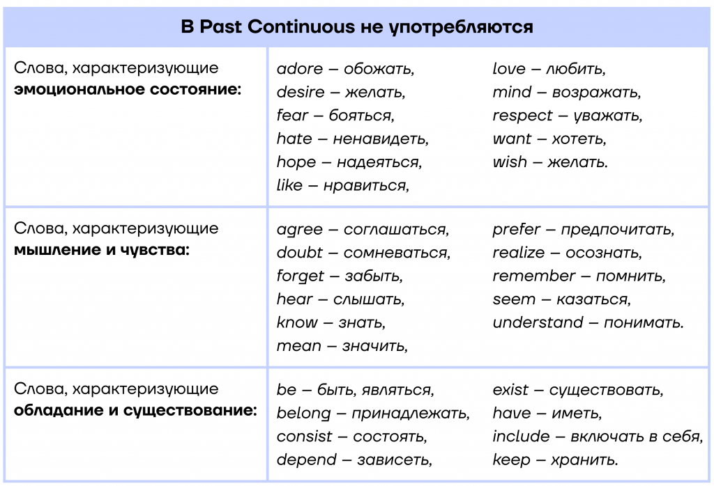 - Есть ряд слов, которые не употребляются в Past Continuous. Вместо прошедшего длительного времени употребляем их в Past Simple.