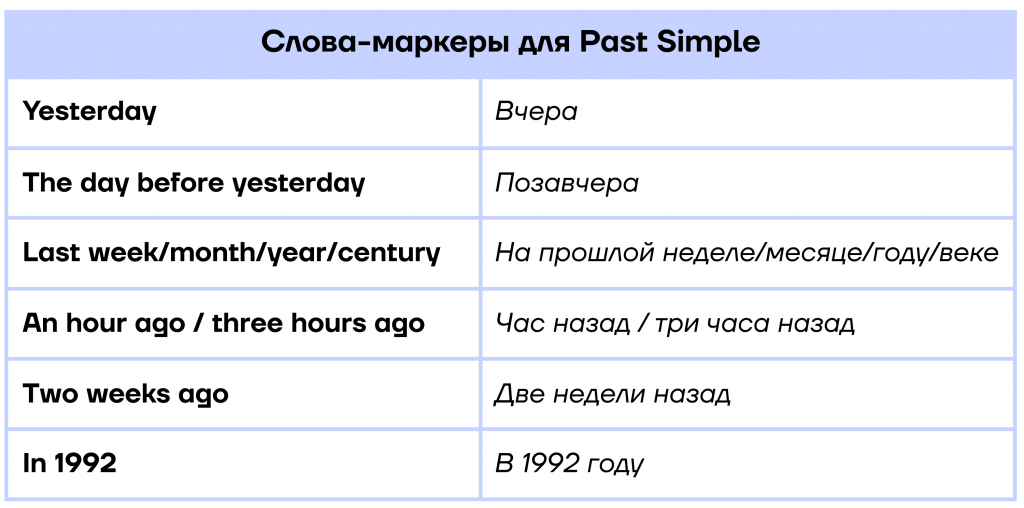 Как мы уже говорили выше, для каждого времени в английском языке есть свои «подсказки» — слова-маркеры, и прошедшее простое — не исключение.