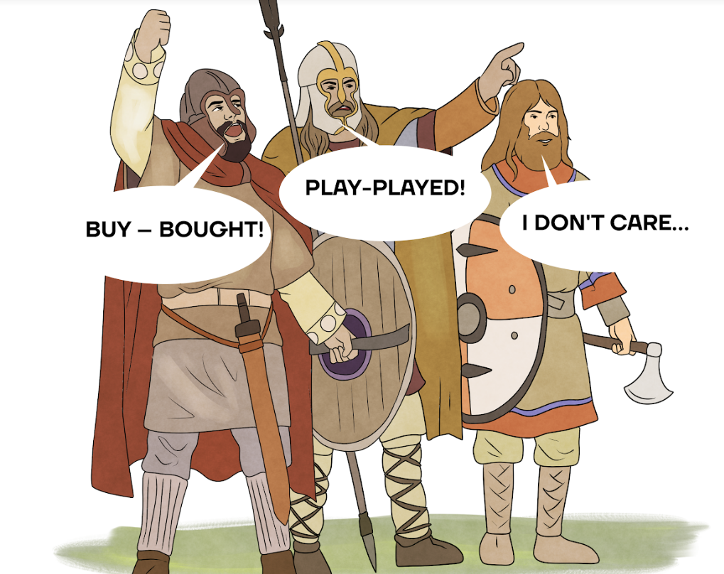 | Кто придумал неправильные глаголы и почему раньше их называли «сильными»? Англы и саксы не только вторглись в Англию почти 15 веков назад, но и значительно перевернули правила языка, придумав новый — Englisc (древнеанглийский или англосаксонский язык). Отголосками этого языка и являются неправильные глаголы. Конечно, в средневековье никто и не думал о правилах — все говорили так, как получалось, и ошибки никого не волновали. Поэтому и не удивительно, что люди не сумели объединить правила разных языков в одном. Глаголы, которыми пользовались чаще всего в речи, оставили как есть, то есть как привыкли люди. Для того чтобы показать, что речь идет о прошедшем времени, они меняли форму глагола (buy — bought). Такие глаголы назвали «сильными» (современный вариант — неправильные). А те, что использовались реже, подвели под одно единое правило: к основе глагола добавляется окончание -ed (play — played), это и есть современный вариант правильных глаголов. |
