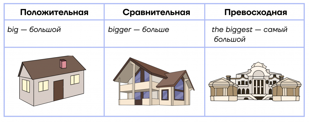 Положительная степень прилагательного — это основная степень прилагательного, которая указывает на признак предмета, то есть это самые простые прилагательные, вроде big (большой), beautiful (красивый), handsome (симпатичный) и так далее.