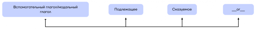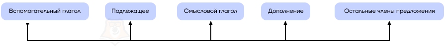 - Вспомогательный глагол + подлежащее + смысловой глагол + дополнение + остальные члены предложения;