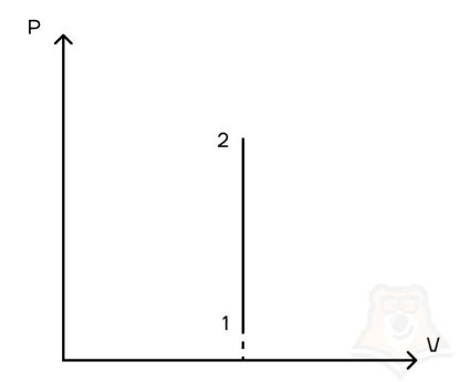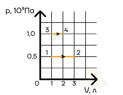 Если посмотрим на график в координатах p—V, то он представляет собой прямую линию, которая не имеет площади. Это еще одно пояснение, почему работа газа при изохорном процессе равна нулю.
