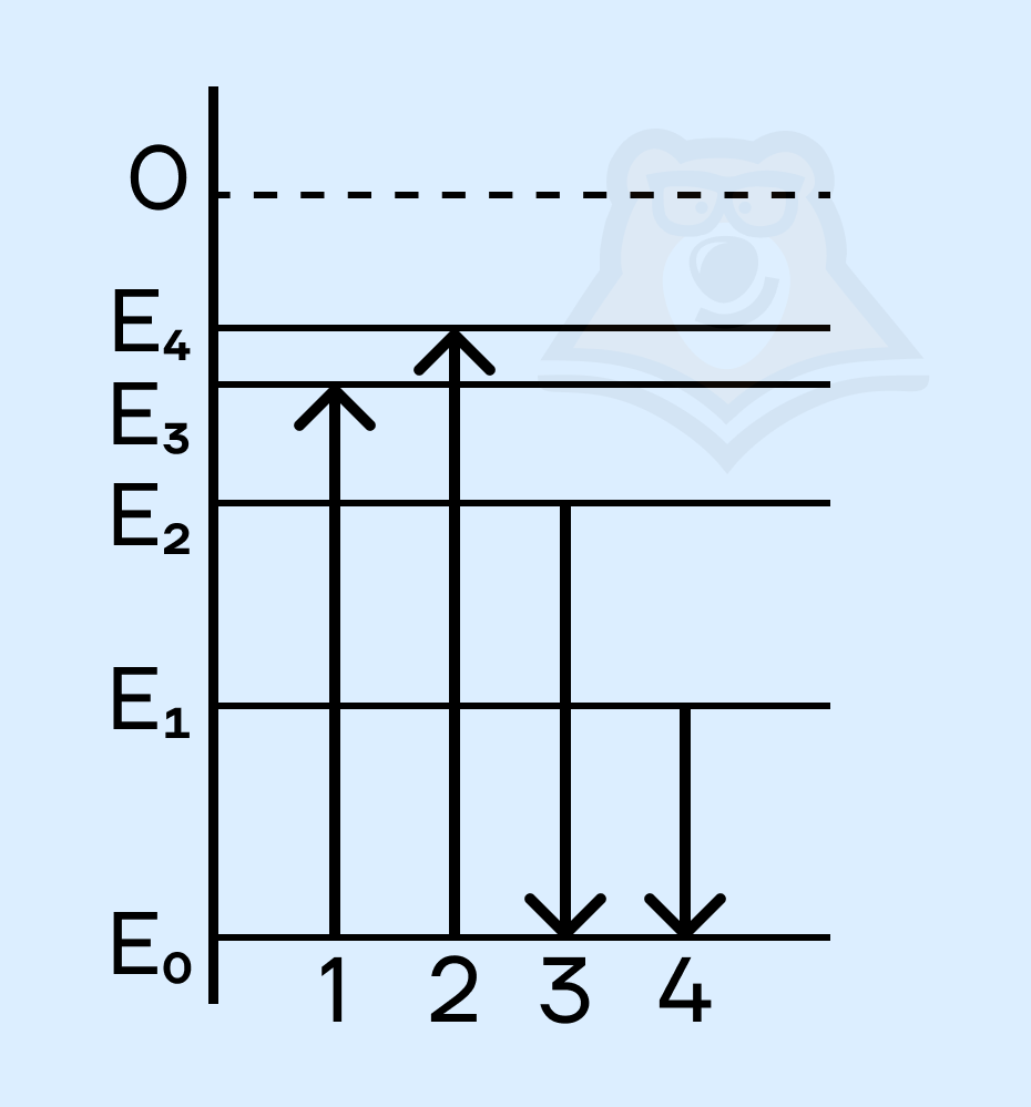 На энергетической диаграмме некоторого газа показан набор из четырех переходов атома между энергетическими состояниями. Определите, какому переходу соответствует наименьший импульс поглощенного фотона. В ответ запишите номер перехода. (Напомним, что наименьший импульс соответствует наименьшей энергии)