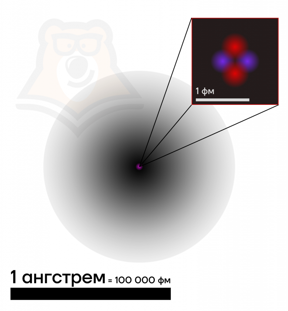 В силу малости размера атома измерять его геометрические характеристики в метрах становится совершенно не информативно. По этой причине в микромире используется такая величина, как ангстрем, равная \(10^{-10}\)м. Ангстрем принято обозначать как Å. Кроме того, для измерения размера атомов используют фемтометры (\(1\) фм \(= 10^{-15}\)м). Тогда ангстрем можно сравнить с фемтометрами следующим образом: \(1\) Å\(= 100 000\) фм.