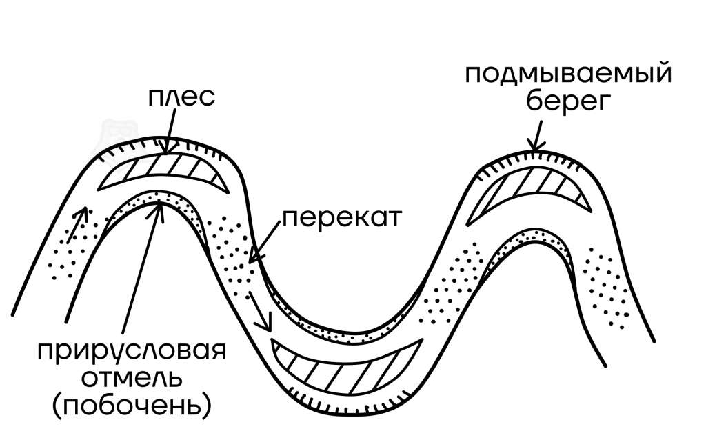 Русло имеет порой очень причудливые формы. Изгибы русла называют меандрами. Они образуются, когда река не может преодолеть какое-то препятствие и начинает течь извилисто. Вместе с этим формируются: