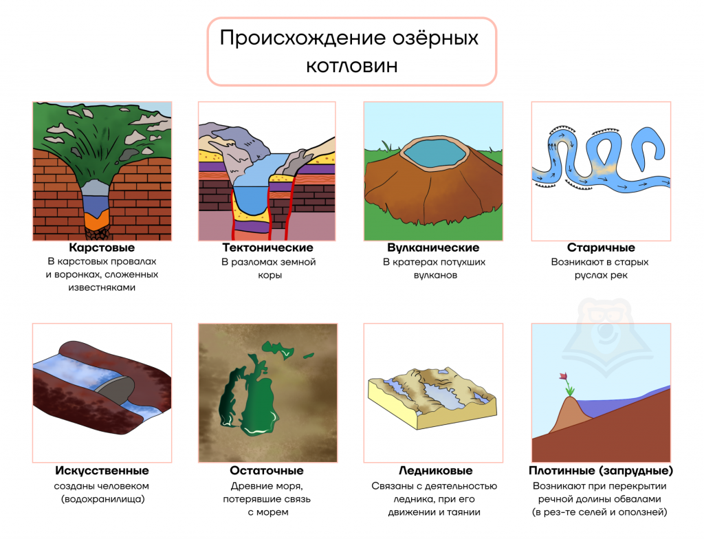 Размер и форма озер зачастую зависит именно от происхождения их котловин (углублений). Они могут быть: