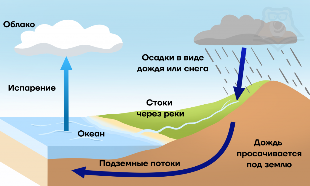 Описанный выше цикл повторяется снова и снова. Попавшая в водоем вода испарится, затем начнется конденсация, последующее выпадение осадков и снова – возвращение воды в водоемы.