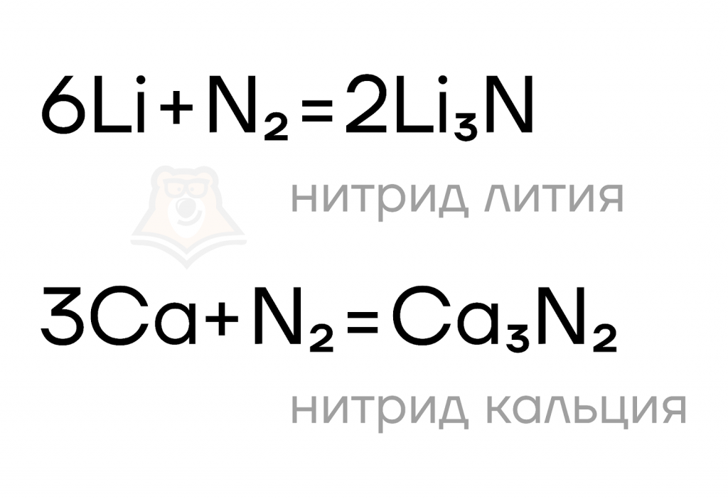 ️Азот взаимодействует с активными металлами: металлами IA- и IIA-групп, а также с алюминием. В данных реакциях азот проявляет свои окислительные свойства. В результате реакции образуются нитриды. При обычных условиях реакция протекает только с литием и магнием, для взаимодействия с остальными металлами требуется повышенная температура.