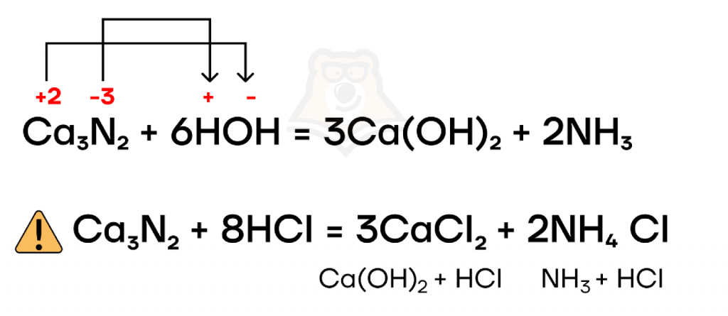 Как и многие другие бинарные соединения, нитриды могут гидролизоваться в разных средах. Уравнения этих реакций мы записываем по принципу «плюс к минусу»: к катиону присоединяем гидроксильную группу, а к аниону — водород.