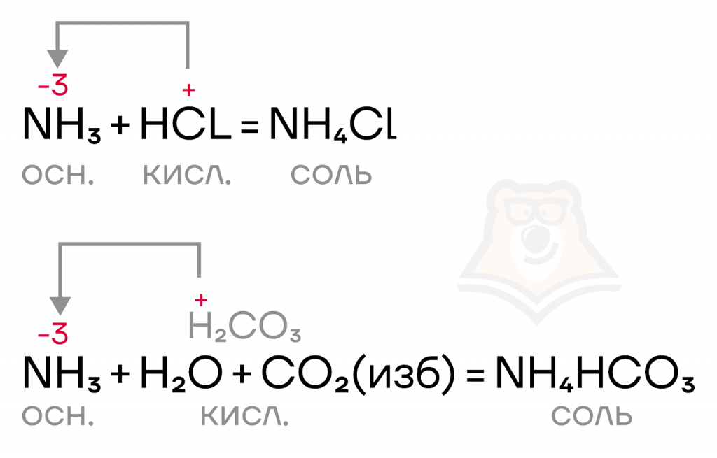 Аммиак обладает основными свойствами, поэтому реагирует со своими противоположностями — кислотами с образованием солей аммония.