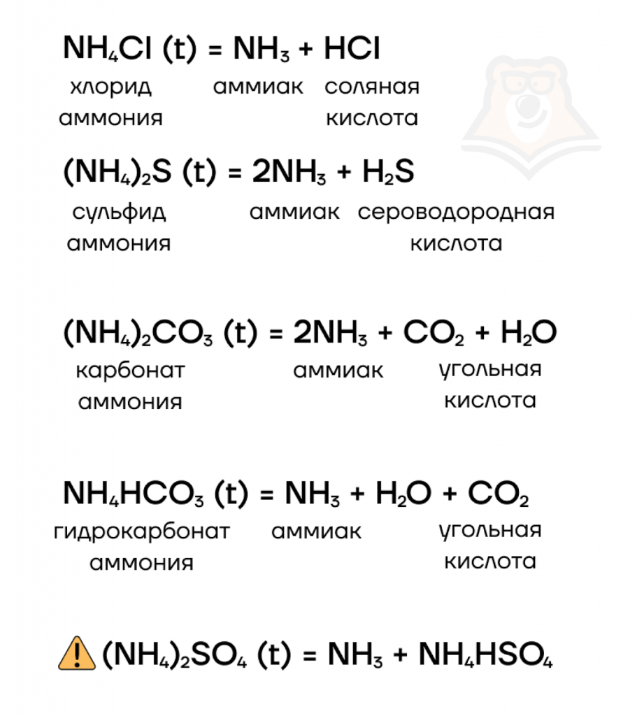 Соли аммония при нагревании разлагаются. Чаще всего в результате получается то, из чего они образуются: аммиак и соответствующая кислота, но есть и исключение — при разложении сульфата аммония образуется аммиак и гидросульфат аммония.