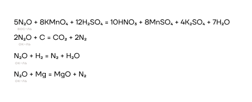 Бесцветный газ со сладковатым запахом, обладает наркотическим эффектом, может быть получен в ходе разложения нитрата аммония: