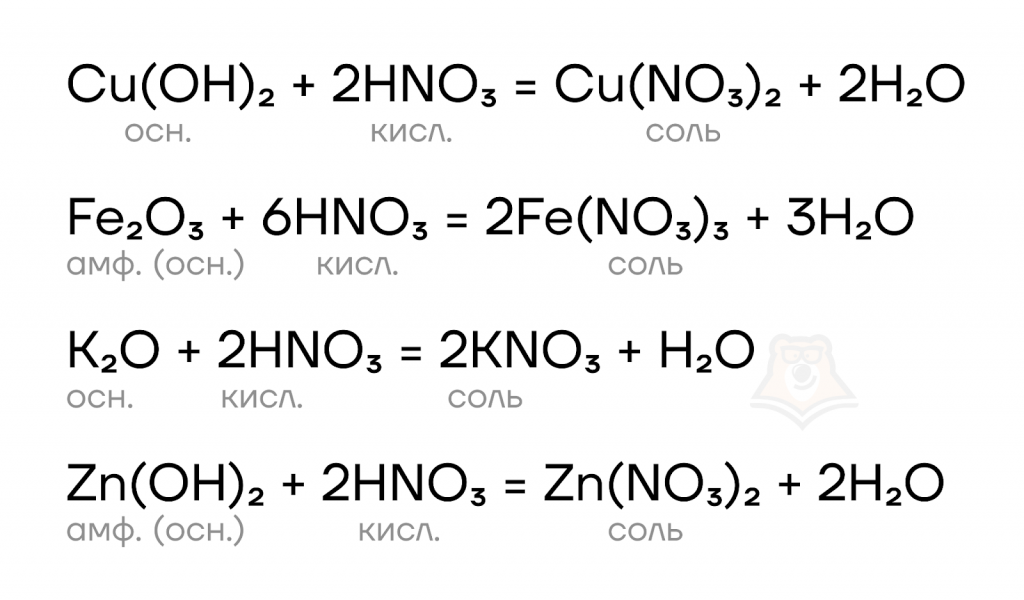 Кислоты, в том числе и азотная, являются электролитами. Поэтому они способны вступать в реакции ионного обмена с другими электролитами: солями и основаниями (если среди продуктов реакции есть газ, осадок или слабый электролит). Если хотите освежить в памяти информацию по реакциям ионного обмена — посмотрите статью «Реакции ионного обмена».
