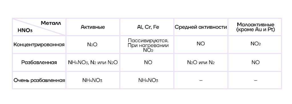 Продукты взаимодействия с азотной кислотой зависят как от активности металла, так и от концентрации кислоты. Вне зависимости от условий образуются соль и вода, а остальные продукты представлены в таблице: