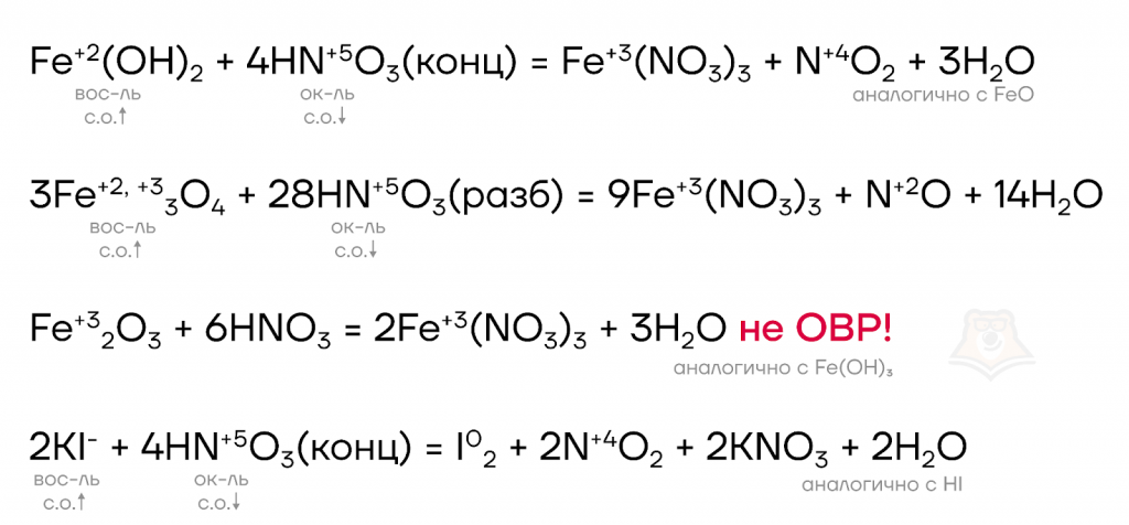 Ниже представлены примеры некоторых окислительно-восстановительных реакций с участием азотной кислоты.