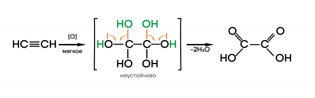 Мягкое окисление характерно только для ацетилена, остальные алкины окисляются до карбоновых кислот только в кислой или щелочной среде.