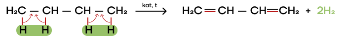Из бутана можно получить бутадиен путем дегидрирования. От четырех атомов углерода уходит по одному атому водорода и образуются две двойные связи, а значит, алкадиен.