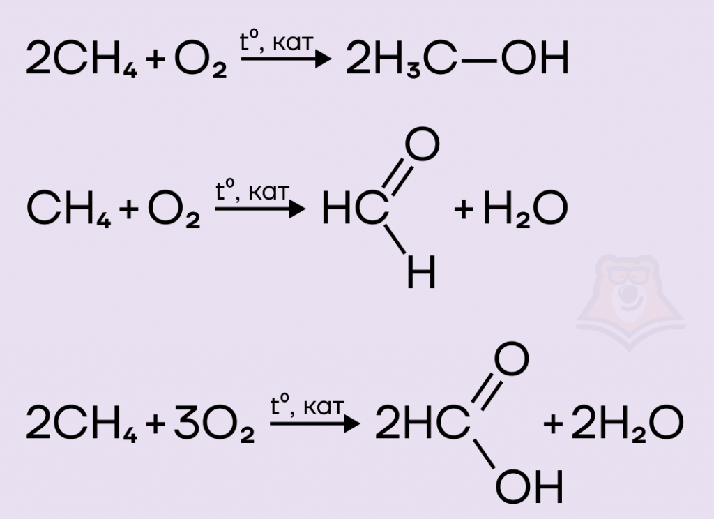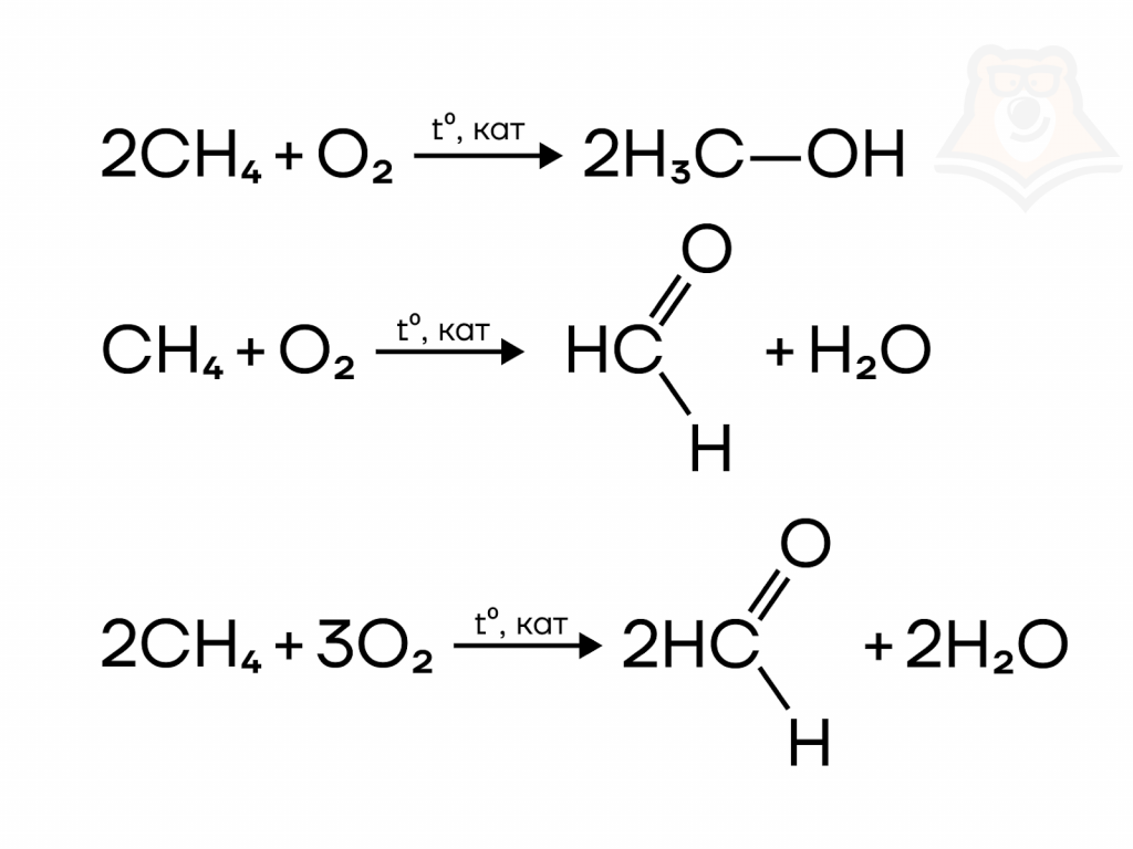 Реакция проводится в присутствии катализатора, в зависимости от условий может образоваться весь набор кислородсодержащих соединений: спирт, альдегид или карбоновая кислота.