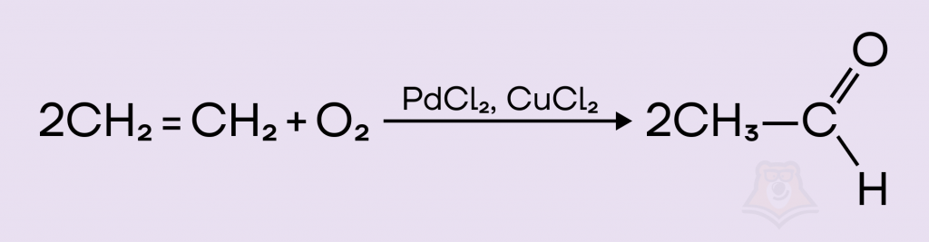 Каталитичекое окисление алкенов протекает в присутствии катализаторов хлорида палладия и хлорида меди(II), данная реакция возможна только для этилена и приводит к образованию этаналя (уксусного альдегида).