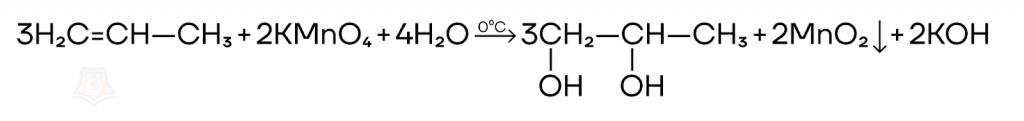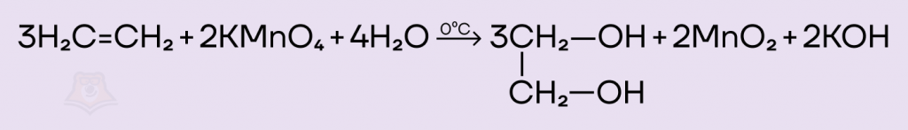 В нейтральной среде при температуре 0°C алкены окисляются раствором перманганата калия до двухатомных спиртов (мягкое окисление, реакция Вагнера).