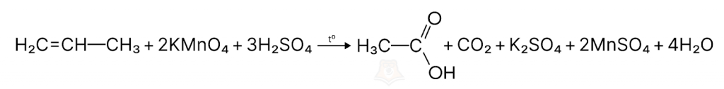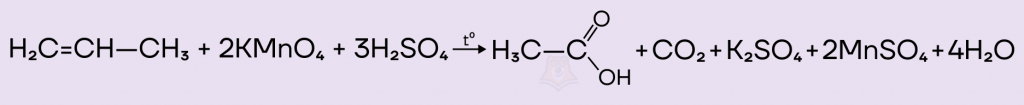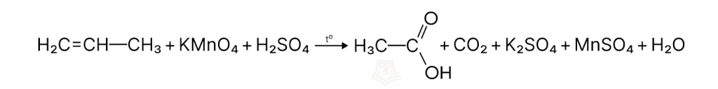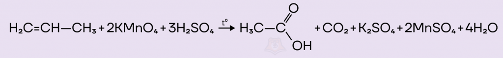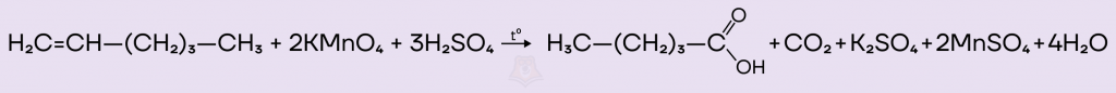 Проводят сильными окислителями при нагревании, цепь алкена разрывается по месту двойной связи, образуются два продукта, строение которых зависит от строения исходной цепи. Продукты также зависят от среды протекания процесса.