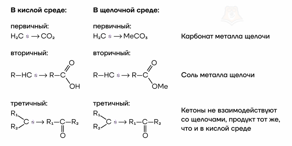 - Окисление веществ с кратной связью может быть жестким: образуются карбоновые кислоты, их соли или кетоны, — а также мягким: образуются диолы.