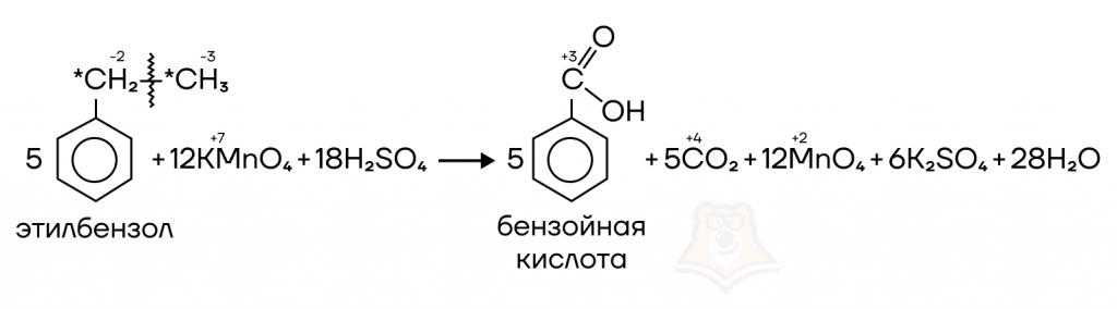 Разберем примеры реакций. В ходе окисления этилбензола в кислой среде происходит разрыв связи в радикале: одна часть углеродной цепи окисляется до бензойной кислоты, а оставшийся — до СО2.