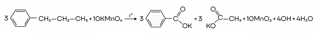А вот при окислении пропилбензола в нейтральной среде образуется соль карбоновой кислоты (ацетат калия) и соль бензойной кислоты (бензоат калия).