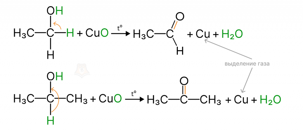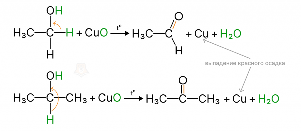 Под действием оксида меди(II) из первичных спиртов образуются альдегиды, из вторичных — кетоны, третичные спирты не вступают в подобные реакции.