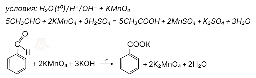 При окислении перманганатами или хроматами в кислой среде альдегиды превращаются в карбоновые кислоты, в нейтральной или щелочной — в соли карбоновых кислот.