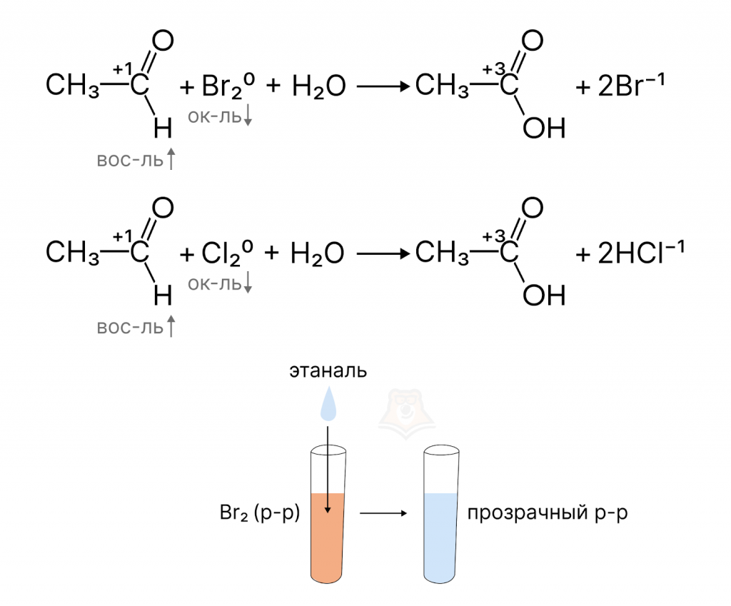 Хлор и бром, являясь сильными окислителями, могут также окислять альдегиды до карбоновых кислот. При этом в случае с бромной водой происходит обесцвечивание раствора.