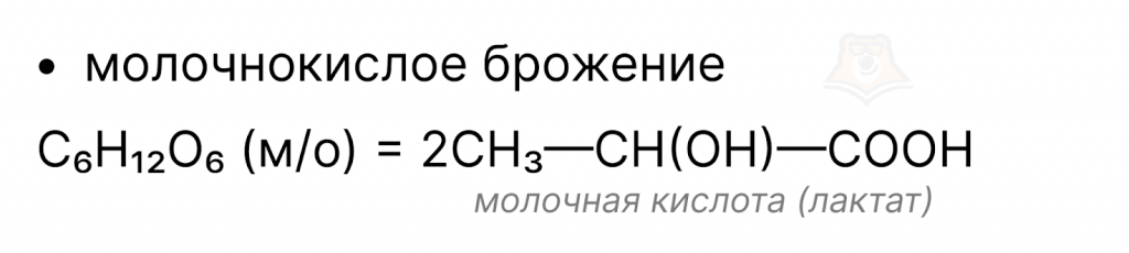 - Молочнокислое брожение, как очевидно следует из названия, приводит к образованию молочной кислоты.