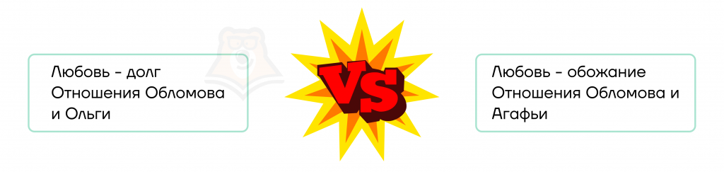 | Отношение Обломова | «Разве любовь не служба?» | «Он глядел на нее с легким волнением, но глаза не блистали у него, не наполнялись слезами, не рвался дух на высоту, на подвиги. Ему только хотелось сесть на диван и не спускать глаз с ее локтей». |