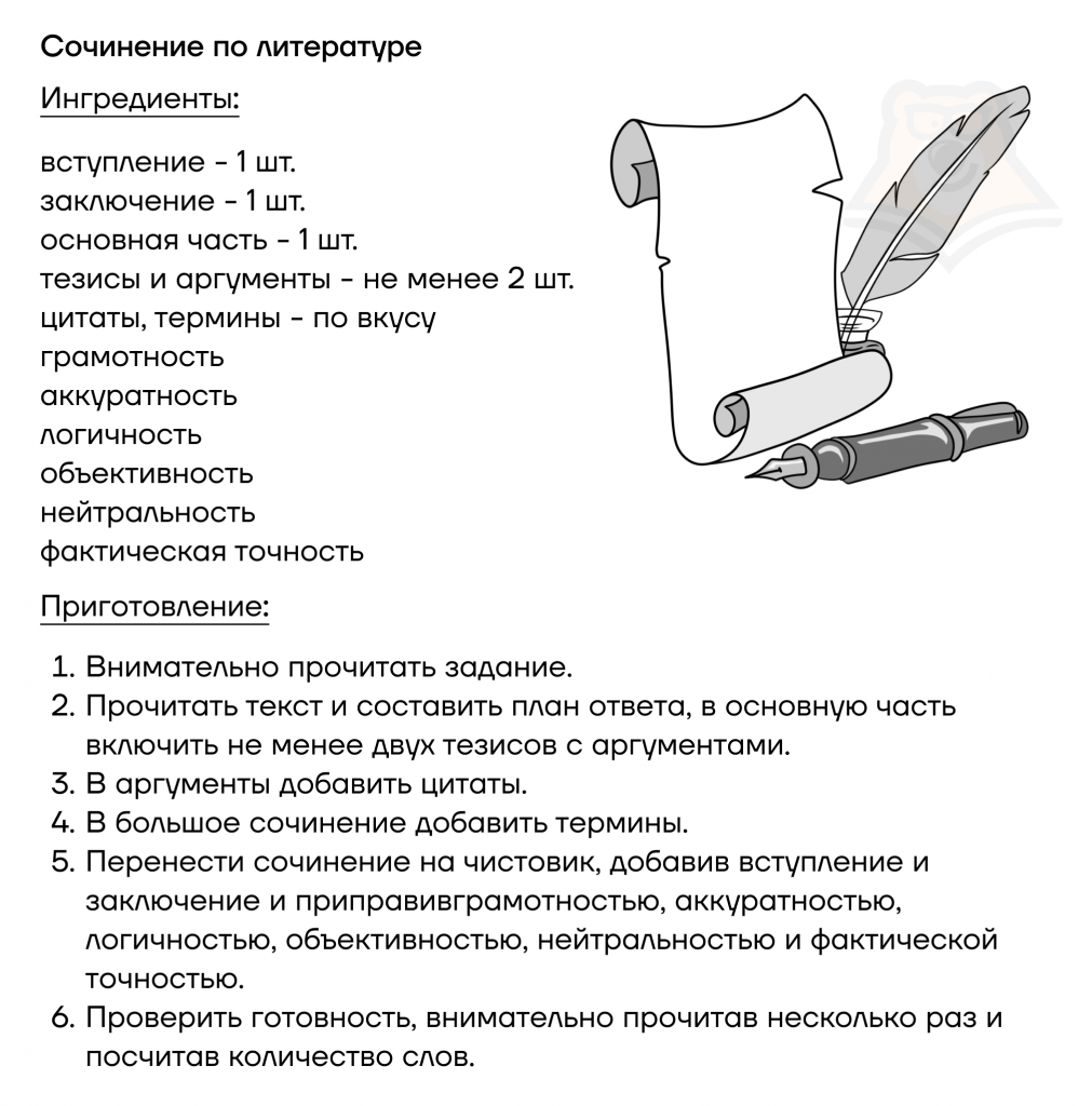 Можно прочитать все произведения из кодификатора, можно выучить наизусть все стихотворения и все равно не сдать экзамен, если не научиться самому важному — писать сочинения. Ведь как иначе продемонстрировать эксперту свои знания? Так что скорее читайте нашу статью и берите на заметку все лайфхаки! Они однозначно пригодятся вам на экзамене.