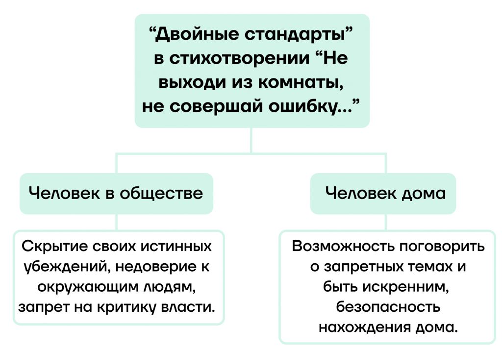 - Стихотворение И.А. Бродского «Не выходи из комнаты, не совершай ошибку…» связано с историческим контекстом. Из-за запрета на критику власти СССР, люди могли быть откровенны, только находясь у себя дома. Бродский иронизирует над таким стилем жизни, где люди не жалуются на отсутствие свободы.