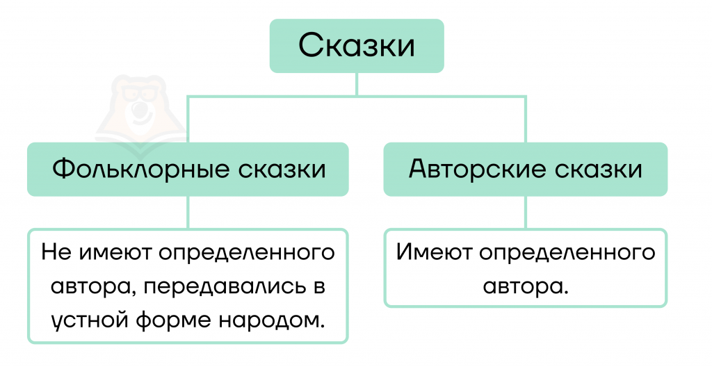 - Есть два вида сказок — авторская и фольклорная. Авторская относится к художественной литературе, фольклорная — к устно-народному творчеству.
