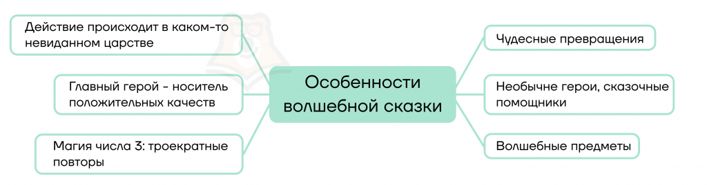 Главная отличительная черта волшебной сказки — наличие волшебства. Запоминаем — превращения, летающая ступа, игла в яйце, Конек-Горбунок и другие фантазийные герои и предметы — черты волшебной сказки.