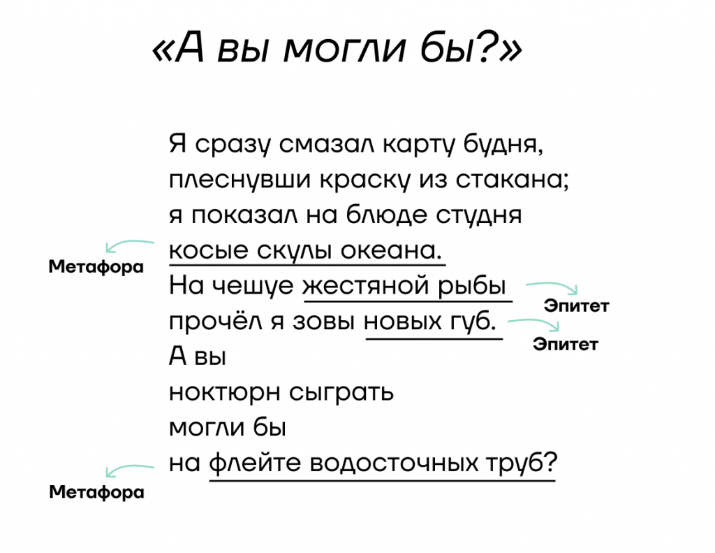 Обратите внимание на следующие метафоры: «я показал на блюде студня / косые скулы океана», «На чешуе жестяной рыбы / прочел я зовы новых губ», «флейте водосточных труб». То, что для нас обыденные вещи, для лирического героя-поэта — источник вдохновения. С помощью этих художественных средств автор оригинально изображает индустриальный пейзаж. Для поэта даже такой серый мир полон красок.