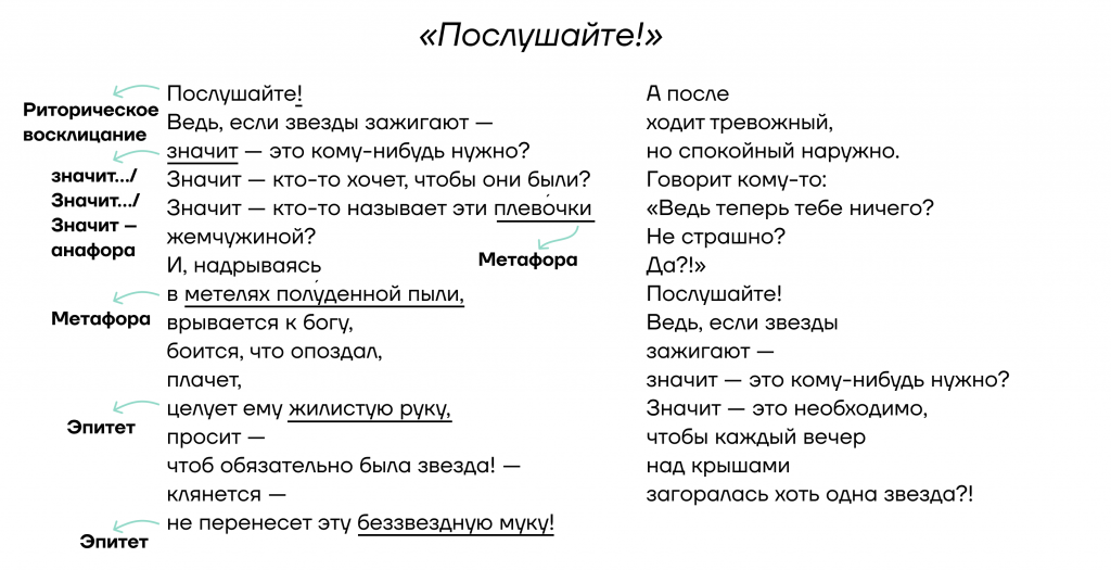 - Риторические восклицания/вопросы: «Послушайте!», «Ведь если звезды зажигают — / значит — это кому-нибудь нужно?». Эти стилистические фигуры отражают эмоции лирического героя.