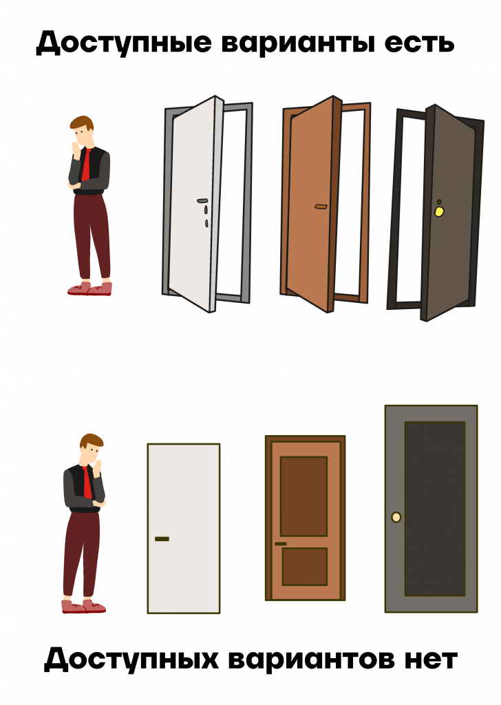 - Евгений приехал на море и заселяется в отель. Он выбирает между номерами, в первом варианте его не устраивает этаж, во втором — номер слишком мал. В результате Евгений остается без жилья, так как предложенные варианты его не устроили.