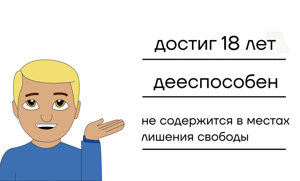 | Дееспособен и не содержится в местах лишения свободы по приговору суда. | Судимость за совершение тяжкого преступления снята/погашена менее 10 лет назад. |